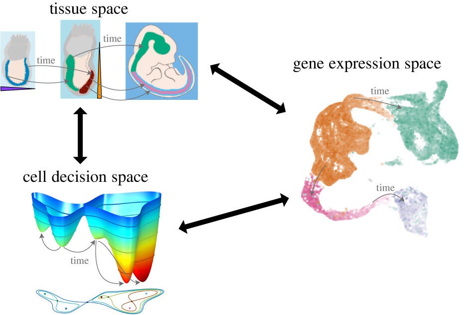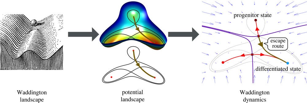 Waddington offered one of the most enduring metaphors in developmental biology: he imagined a cell as a marble rolling down a branching landscape of valleys, each split representing a choice of fate. Would it become a nerve cell, a muscle cell or something else entirely? For decades this image remained more poetic than predictive, a way to think rather than to calculate. In this paper, which is a review (a very good one, indeed), the authors make an effort to put mathematics beneath the metaphor.