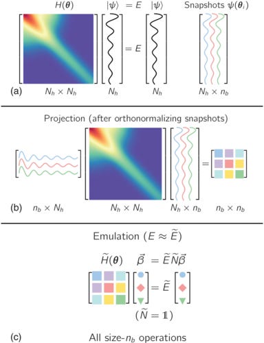 The method exploits this by taking a handful of “snapshots” of exact eigenvectors at selected parameter values and then constructing a reduced variational subspace from them. Once built, this subspace can be used to efficiently approximate eigenvalues and eigenvectors at new parameter values, without having to solve the original, enormous problem again. It is cool because often converges much faster than standard perturbation theory, especially in challenging regimes where traditional expansions might break down.