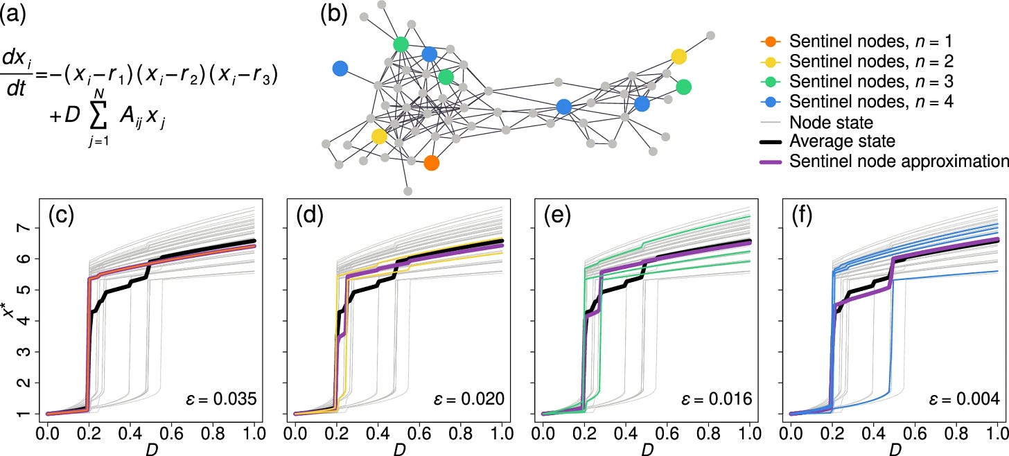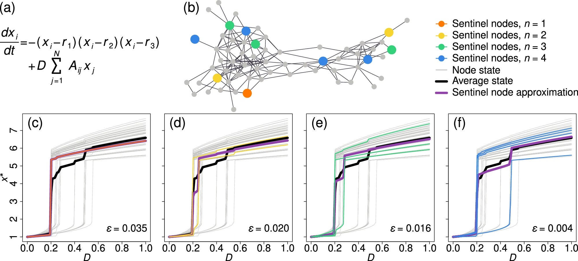 A fundamental premise of statistical physics is that the particles in a physical system are interchangeable, and hence the state of each specific component is representative of the system as a whole. This assumption breaks down for complex networks, in which nodes may be extremely diverse, and no single component can truly represent the state of the entire system. It seems, therefore, that to observe the dynamics of social, biological or technological networks, one must extract the dynamic states of a large number of nodes—a task that is often practically prohibitive. Theoretical tools are also highly restrictive, given the analytically impenetrable combination of complex heterogeneous networks with nonlinear, often hidden, dynamics. To overcome this challenge, we use machine learning techniques to detect the network’s sentinel nodes, a set of network components whose combined states can help approximate the average dynamics of the entire network. The method allows us to assess the equilibrium state of a large complex system by tracking just a small number of carefully selected nodes. We find that the sentinels are mainly determined by the network structure such that they can be extracted even with little knowledge of the system’s specific interaction dynamics. Therefore, the network’s sentinels offer a natural probe by which to observe the system’s dynamic states. Intriguingly, sentinels tend to avoid the highly central nodes such as the hubs.