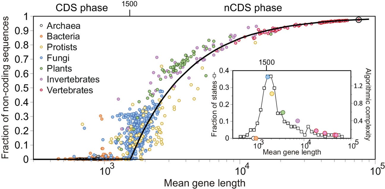 For almost half the history of life on Earth, the complexity of all organisms was limited to that of simple prokaryotic cells such as contemporary bacteria. The process by which genes are activated, which is at the root of the functioning of all living beings, was entirely regulated by proteins. This set up a limit on cellular complexity, as finding even larger proteins became computationally unfeasible. The eukaryotic cell—characterized by membrane-bound nucleus and organelles—emerged as a compromise between a conserved process of gene growth and a change in genetic regulation, which incorporated noncoding sequences. This increase in cellular complexity, which occurred continuously but in an abrupt manner at a critical point, unlocked the path toward multicellular organisms.