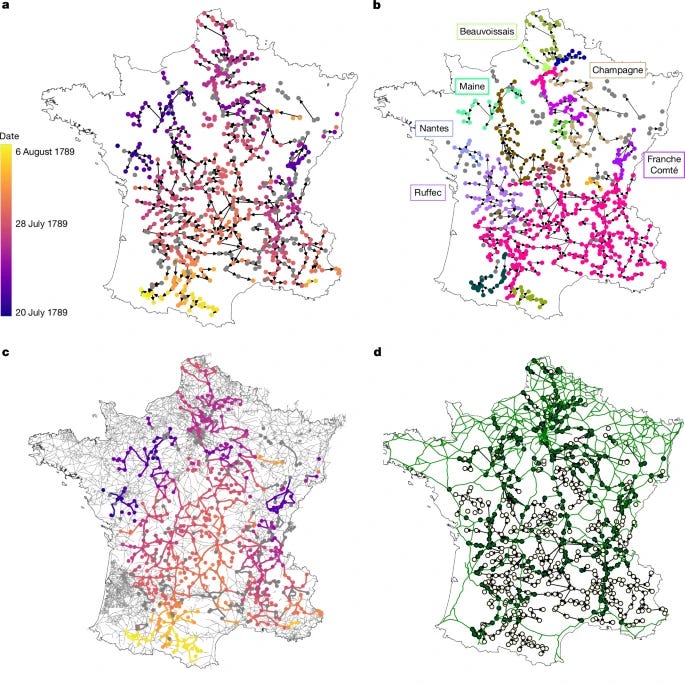 The Great Fear of 1789, a wave of panic and unrest in rural France fuelled by the spreading of rumours, was an important moment at the onset of the French Revolution, marking the collapse of feudalism and the rise of the new regime1. The Great Fear provides a vivid example of the role the spreading of rumours has in driving political changes that might be relevant today2,3. Here, we collect existing historical records related to the Great Fear and use epidemiology tools and models4 to reconstruct the network of its transmission from town to town. In this way, we quantify the spatiotemporal spread of the rumours and compute key epidemiological parameters, such as the basic reproduction number. Exploiting information on the structure of the road network in eighteenth century France5, we estimate the most probable diffusion paths of the Great Fear and quantify the distribution of spreading velocities. By endowing the nodes in our reconstructed network with indicators related to the institutional, demographic and socio-economic conditions of the time6, including literacy, population size, political participation, wheat prices7,8, income and ownership laws9, and the unequal distribution of land ownership, we compute factors associated with spread of the Great Fear. Our analysis sheds light on unresolved historiographic issues on the significance of the Great Fear for the French Revolution, providing a quantitative answer to the unresolved debate between the role of emotions and rationality in explaining its diffusion.